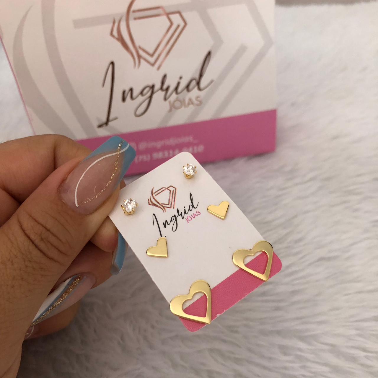 Trio De Brinco Semijoia Corações E Pedrinhas